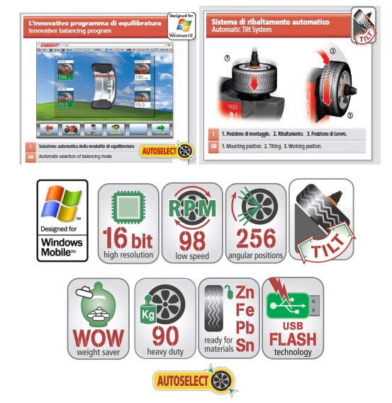 Based on the Videotronic technology, the balancer is controlled by a Personal Computer, with Windows CE operating system. User can easily control all functions through an LCD monitor: with the use of graphics and icons, using the wheel balancer is absolutely intuitive. No confusing “frills”, no strange “gadgets”. Instead, a well-tested user-friendly interface with buttons and icons for a professional use. Fast, clear, effective.